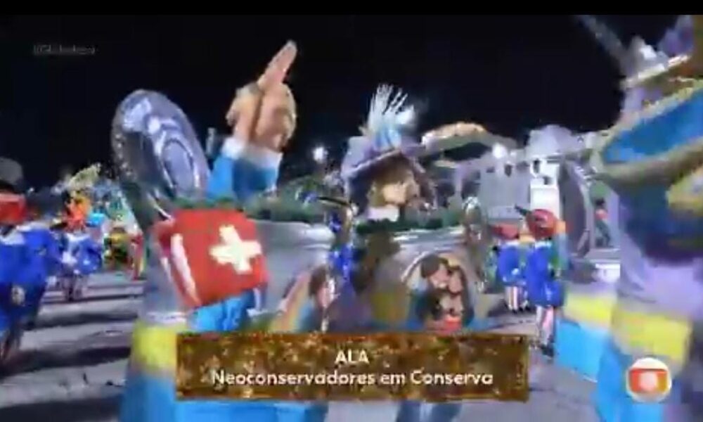 Ala com fantasias de latas de sardinha faz referência a evangélicos em desfile pró-Lula no Rio.