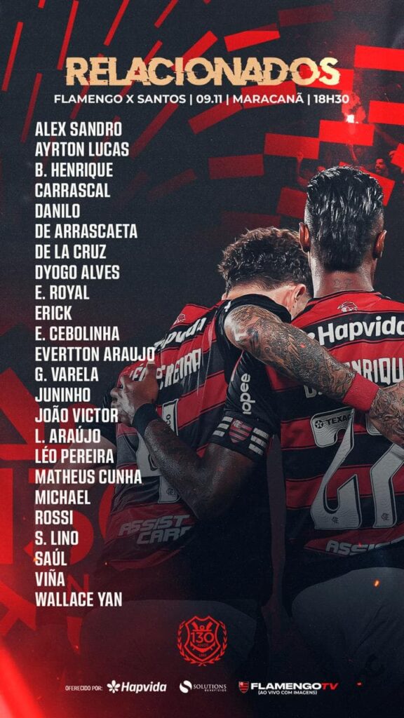 O Flamengo divulgou a lista de convocados por Filipe Luís para o confronto contra o Santos, que acontece neste domingo (9).