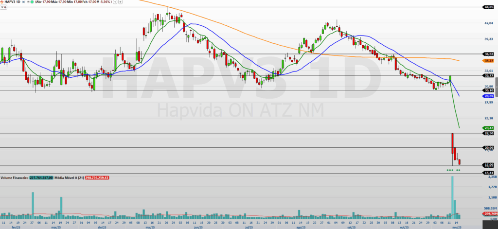 O gráfico de preços da HAPV3 mostra uma pressão vendedora predominante, rompendo suportes importantes e marcando uma mínima histórica de R$ 16,75. A última sessão fechou a R$ 17,00, resultando em uma queda acumulada de 45,65% em novembro e 49,18% no ano. O Índice de Força Relativa (IFR) indica sobrevenda, mas sem sinais de reação técnica até o momento. O cenário permanece amplamente vendedor no curto e médio prazo.