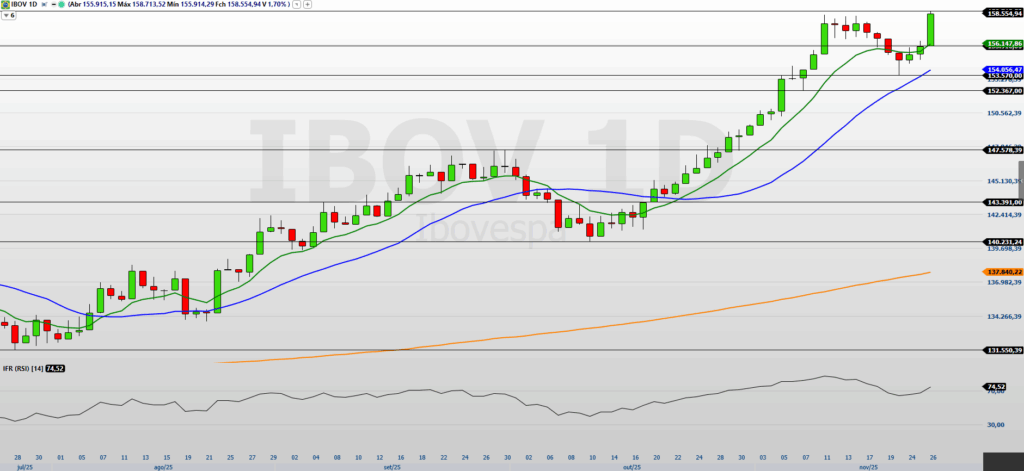O Ibovespa precisa sustentar o fechamento acima de 158.713 pontos para abrir espaço para novos objetivos. Uma reversão exigiria a perda da mínima semanal em 154.529 pontos, o que poderia levar a correções em direção aos suportes mencionados.