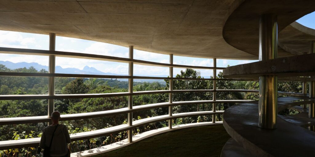Em um dos pontos mais altos do Instituto Inhotim, a escultura monumental Contraplano, de Lais Myrrha, dialoga diretamente com a paisagem circundante. A peça faz referência ao prédio projetado por Oscar Niemeyer na Praça da Liberdade, em Belo Horizonte, e emprega lâminas de concreto armado e colunas de aço inoxidável.