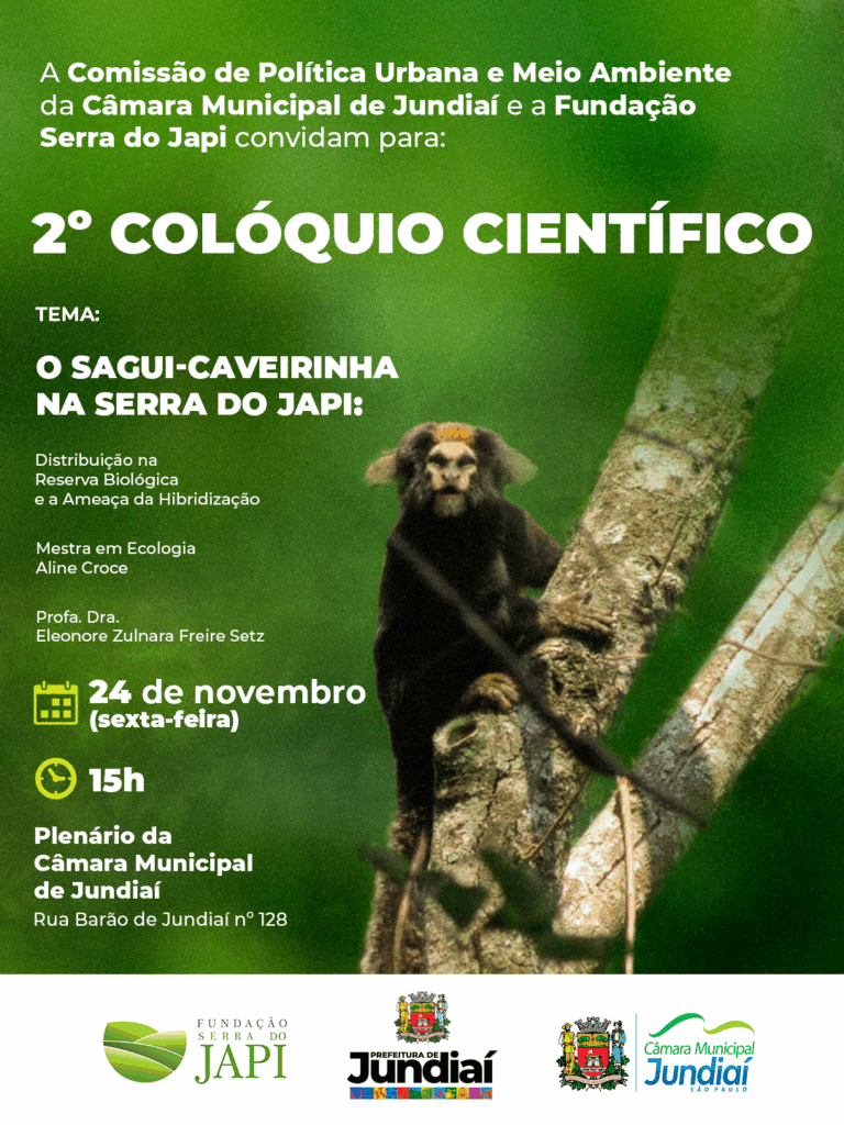 No dia 24 de novembro, às 15h, a Fundação Serra do Japi, em colaboração com a Comissão de Política Urbana e meio ambiente da Câmara Municipal de Jundiaí, promoverá o 2º Colóquio Científico, focado nas ações de pesquisa e conservação do sagui-caveirinha na Serra do Japi. O evento será realizado na Plenária da Câmara e terá como tema “O Sagui-Caveirinha na Serra do Japi: Distribuição na Reserva Biológica e a Ameaça da Hibridização”. Pesquisadores apresentarão novos dados e análises sobre a espécie.