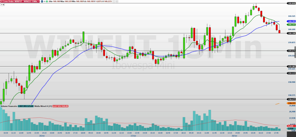 Durante a análise de 15 minutos, o contrato fechou em alta, mostrando uma tentativa de retomada compradora, embora ainda opere abaixo das médias de 9 e 21 períodos. Para que esse movimento ganhe continuidade, é essencial superar a resistência em 160.395/160.840. Uma quebra consistente dessa faixa pode levar o preço à região de 161.170/161.650, com a possibilidade de extensão até 161.930/162.440. Por outro lado, a pressão vendedora deve ganhar força caso o mercado perca o suporte em 160.100/159.670, o que poderia resultar em alvos em 159.285/159.115, com extensão até 158.475/157.900.